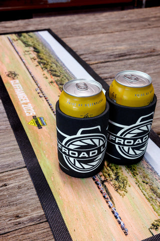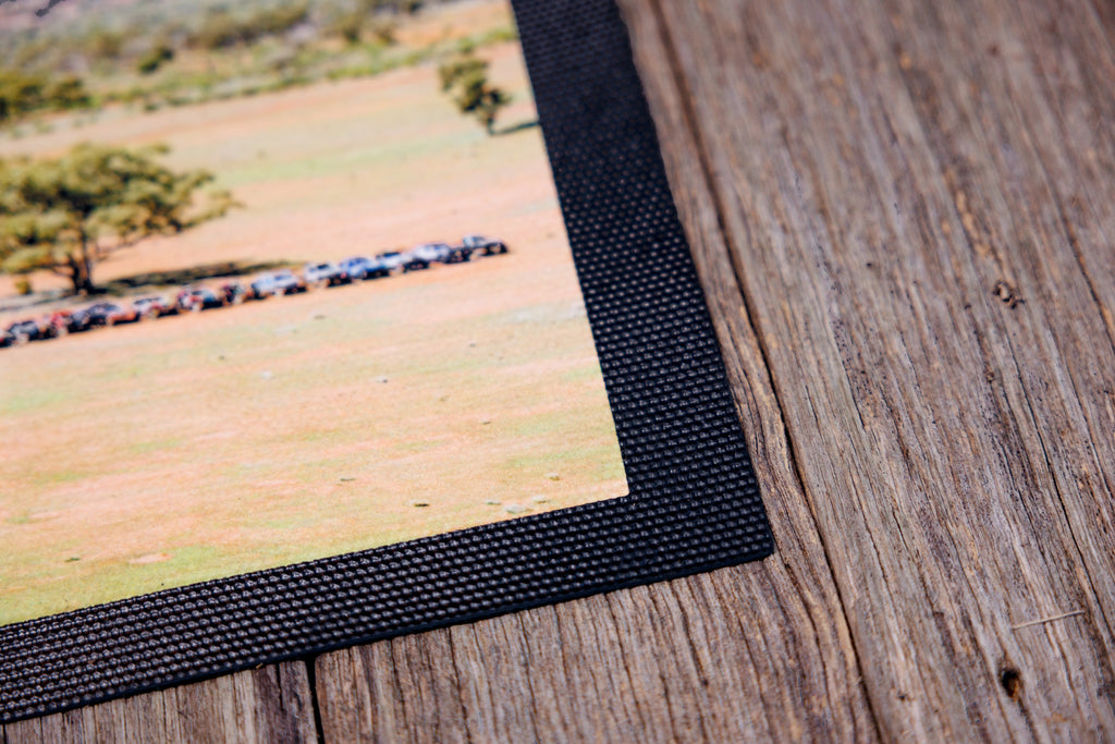 Premium, sublimated, nitrile rubber backed bar mat consisting of 84 race cars and 2 zebras.